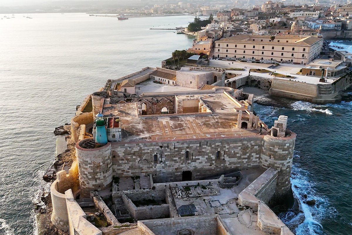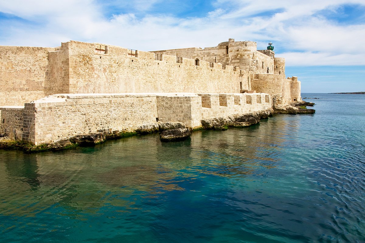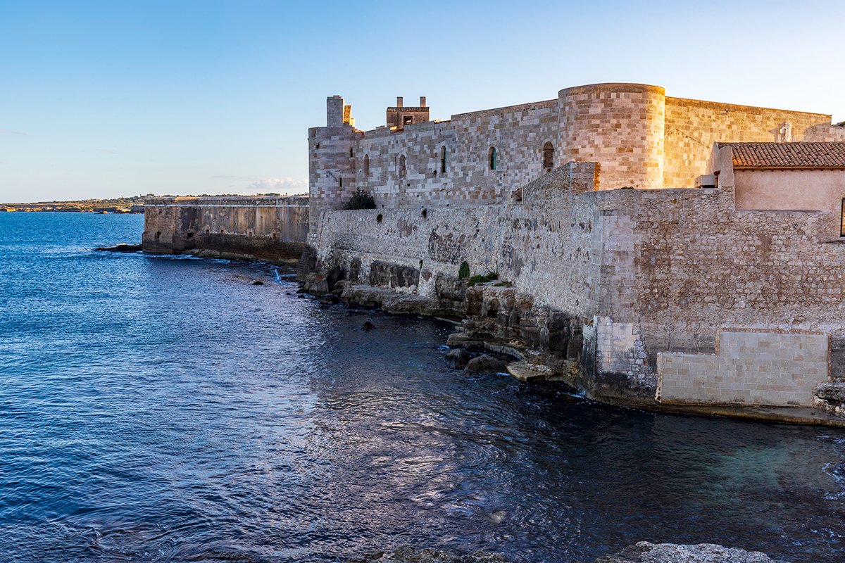 🎭 Famous For: Frederick II’s sea fortress, commanding Ortigia’s harbor, ornate marble portal, and the 1298 siege during the War of the Sicilian Vespers