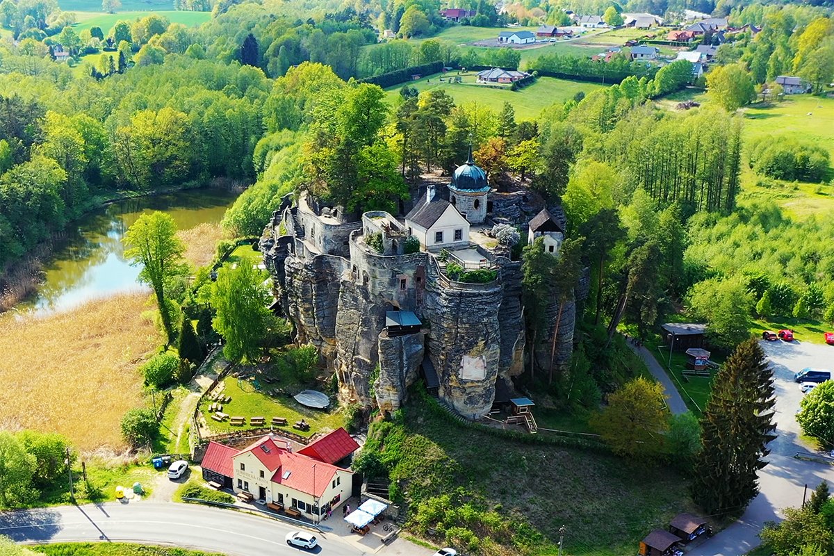 Sloup Castle doesn’t so much sit on a hill as disappear into it. Carved into a freestanding sandstone “column,” this 14th-century rock fortress once watched over a vital salt road—and later sheltered hermits who hollowed out cells, chapels, and stairways in the stone itself. Today, it’s a wonderfully unusual stop: part medieval stronghold, part cliffside sanctuary, crowned by a terrace with sweeping views.