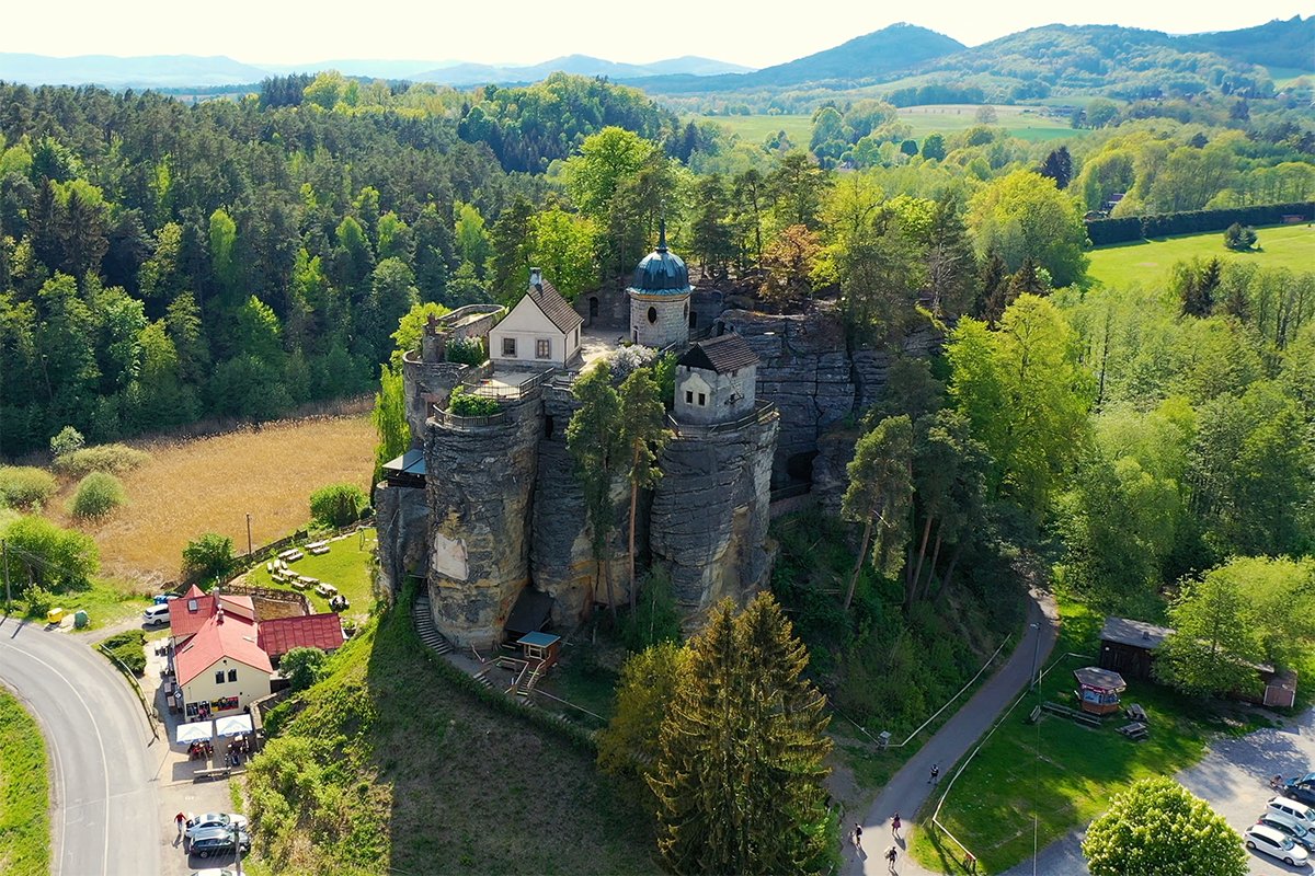 🎭 Famous For: A castle carved into a freestanding sandstone pillar; the Knights’ Stairway; 1445–1447 siege and burning; hermitage rooms and 1693 rock chapel; panoramic lookout over the Lusatian Mountains